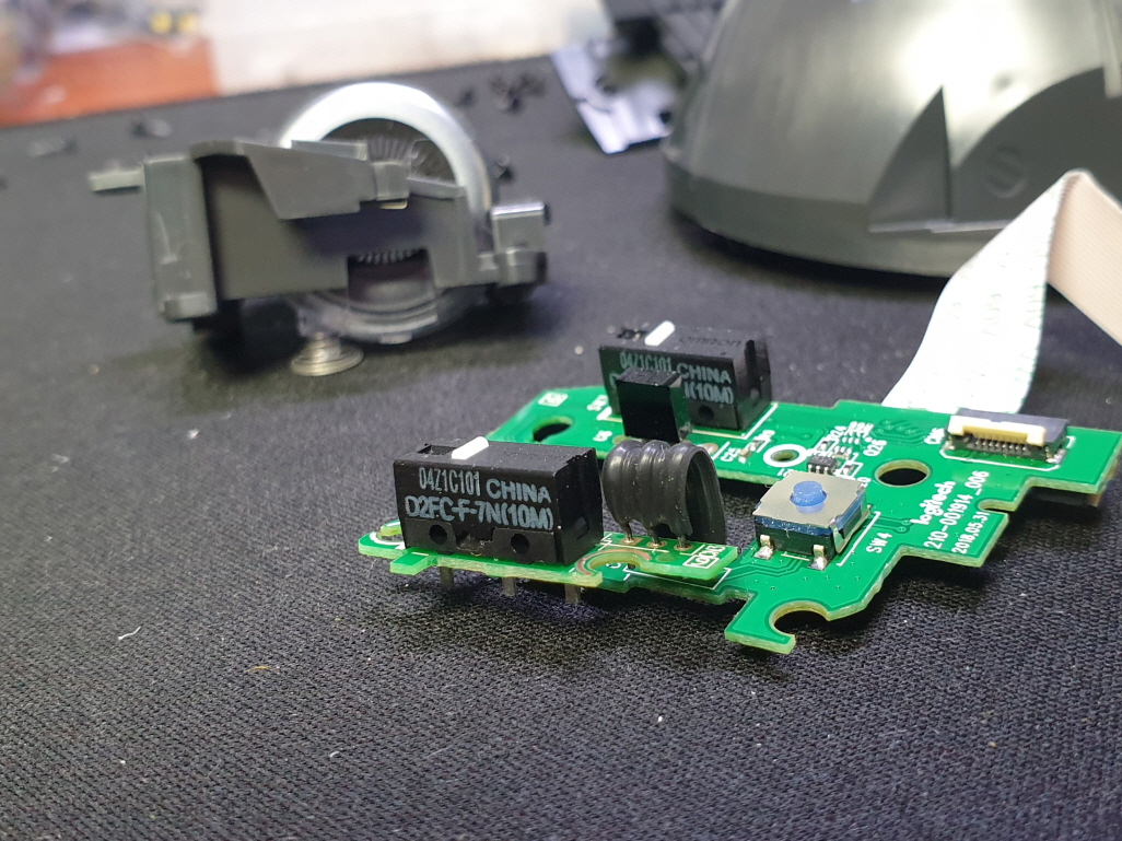 드래그시 풀리거나 잘안눌리는 씹히는 증상, 버튼내 스위치불량으로 새 스위치 D2FC-F-7N(100M) 좌우교체 수리 진행합니다.