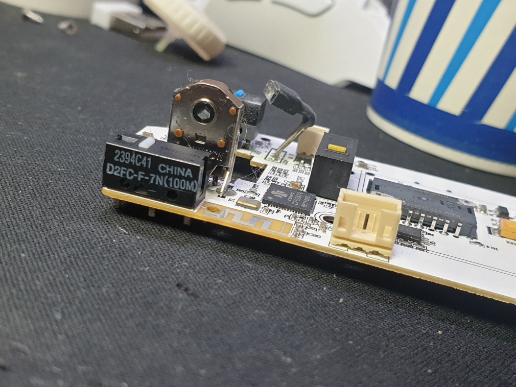 왼쪽버튼 더블클릭증상인 버튼내 스위치불량으로 새 스위치 D2FC-F-7N(100M) 좌우교체 수리 진행합니다. 추가로 앞으로가기 버튼 더블클릭으로 앞뒤스위치도 교체합니다.