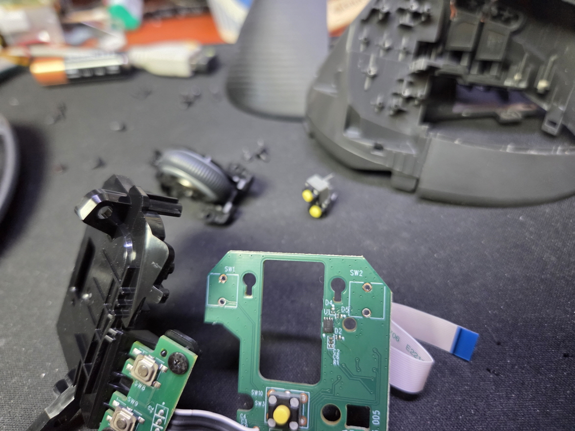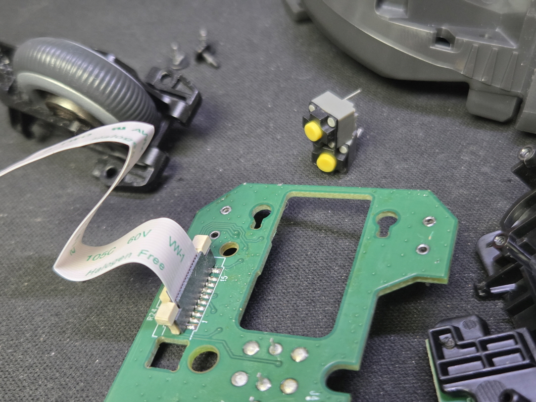 왼쪽버튼 잘안눌리거나 씹힘증상인 버튼내 스위치불량으로 새 스위치 카일 저소음옐로우스위치 좌우교체 수리 진행합니다.