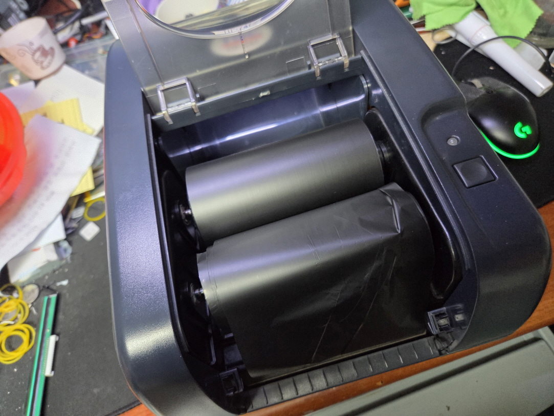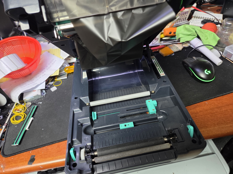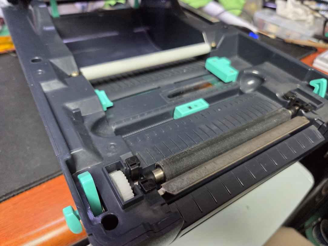 라벨인쇄시 리본(먹지)가 같이 딸려나오는 문제로 수리 진행합니다.