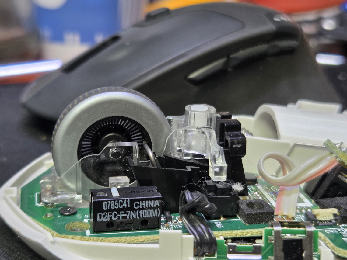 좌버튼 여러번눌리거나 드래그안됨 증상인 버튼내 스위치불량으로 새 스위치 D2FC-F-7N(100M) 좌우교체 수리 진행합니다.