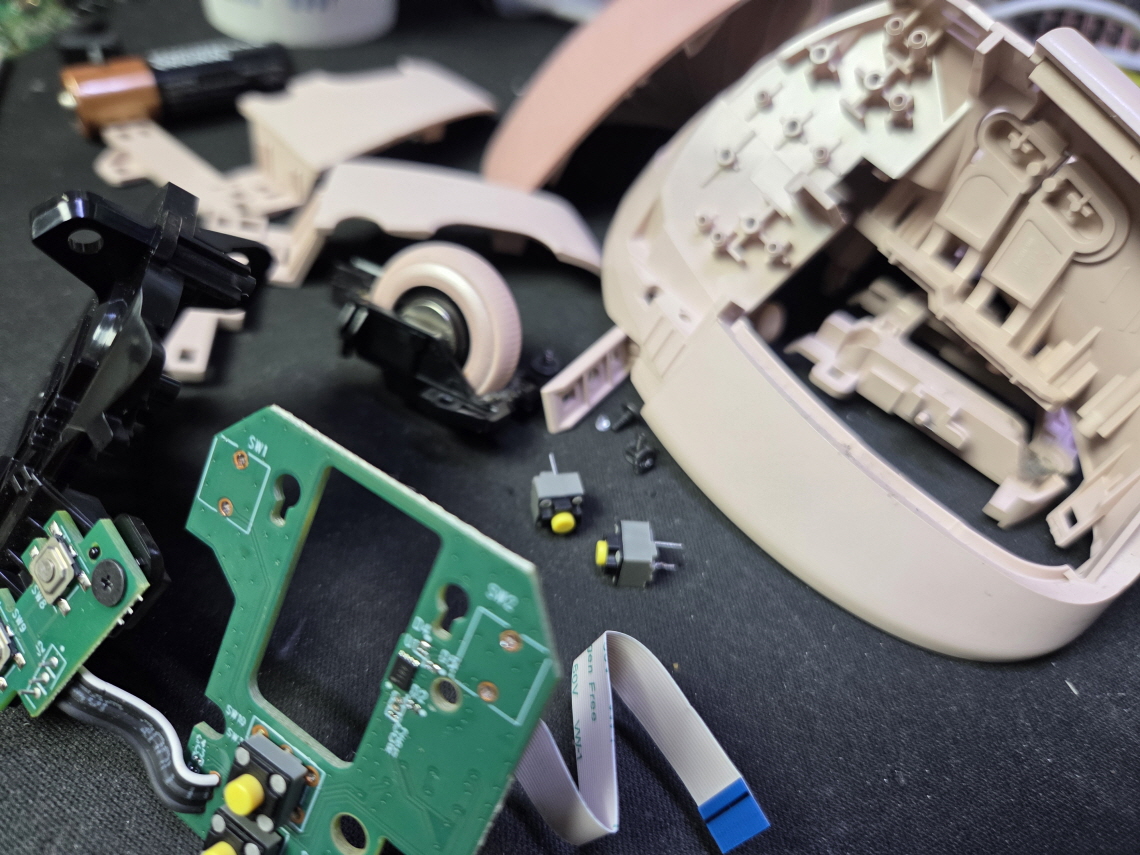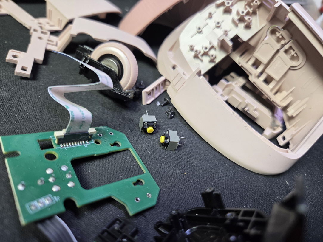 왼쪽버튼 잘안눌림 증상인 버튼내 스위치불량으로 새 스위치 카일 저소음옐로우스위치 좌우교체 수리 진행합니다.