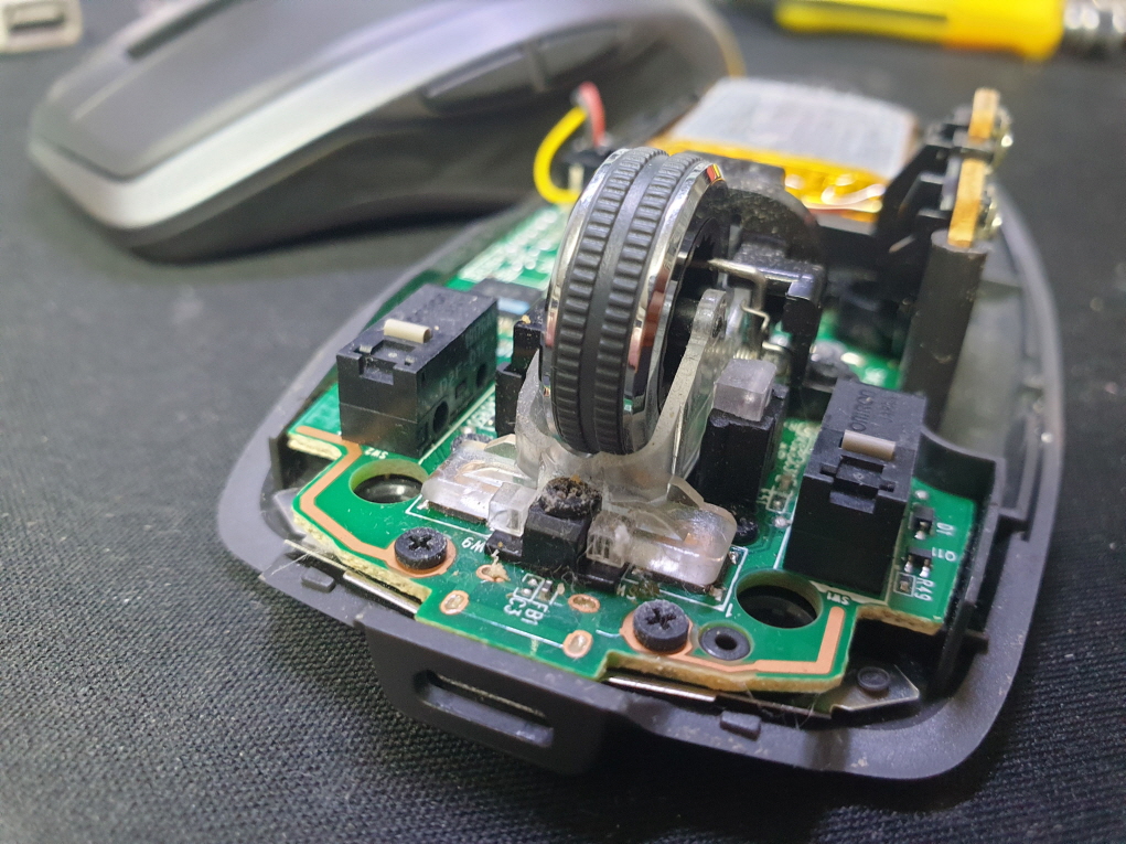 휠센서불량으로 휠센서교체수리 진행합니다. 휠센서불량은 휠팅김, 스크롤시 위아래로 잘 안움직이거나 아예 반응이 없는 경우 발생되는 현상이며 센서교체후 정상적인 사용이 가능합니다.