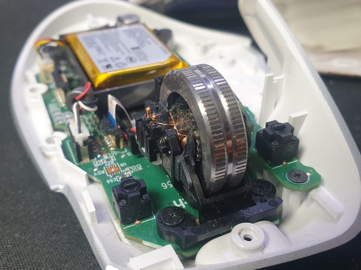 휠센서불량으로 휠센서교체수리 진행합니다. 휠센서불량은 휠팅김, 스크롤시 위아래로 잘 안움직이거나 아예 반응이 없는 경우 발생되는 현상이며 센서교체후 정상적인 사용이 가능합니다.