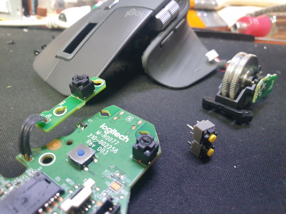 좌버튼 씹힘 증상인 버튼내 스위치불량으로 새 스위치 카일 저소음 옐로우스위치 좌우교체 수리 진행합니다.