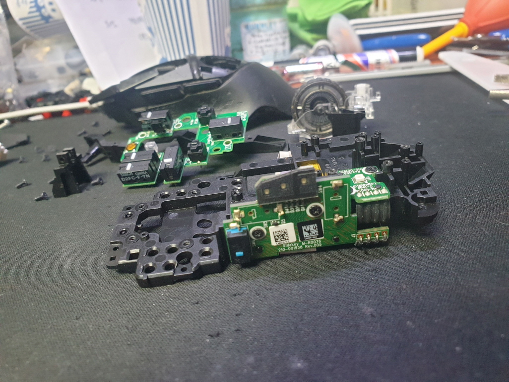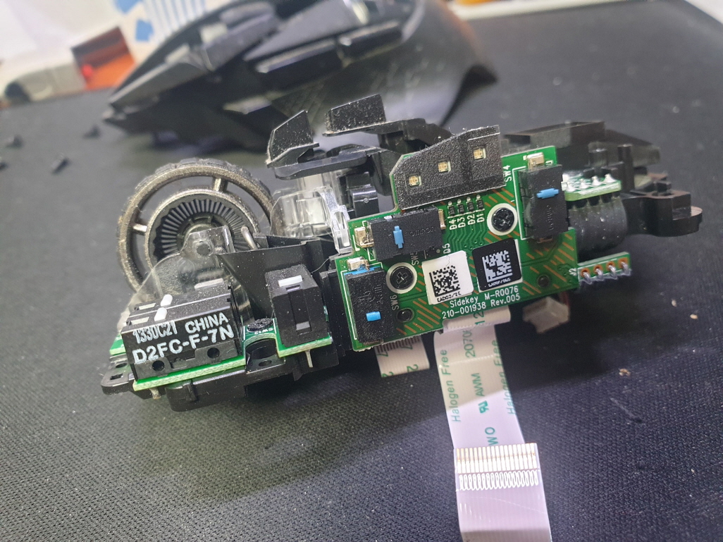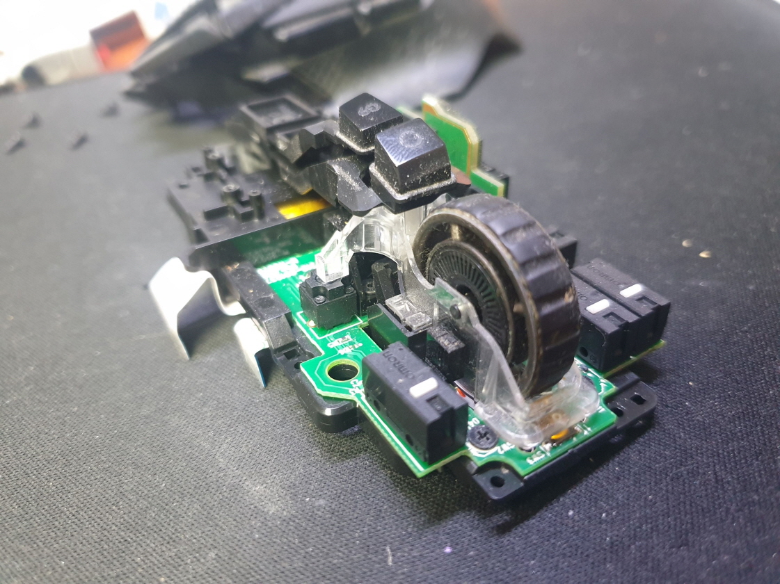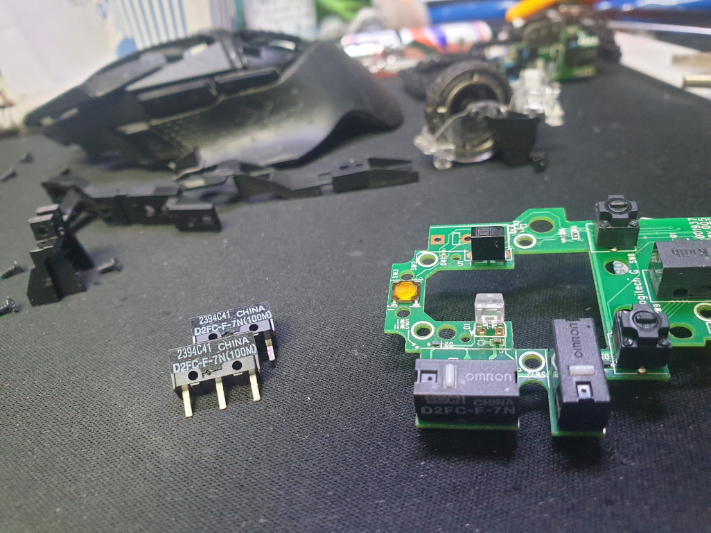 버튼내 스위치불량으로 새 스위치 D2FC-F-7N(100M) 좌우교체 수리 진행합니다. 추가로 측면 앞으로가기 더블클릭 뒤로가기 잘안눌리는 문제로 앞뒤스위치도 교체합니다.