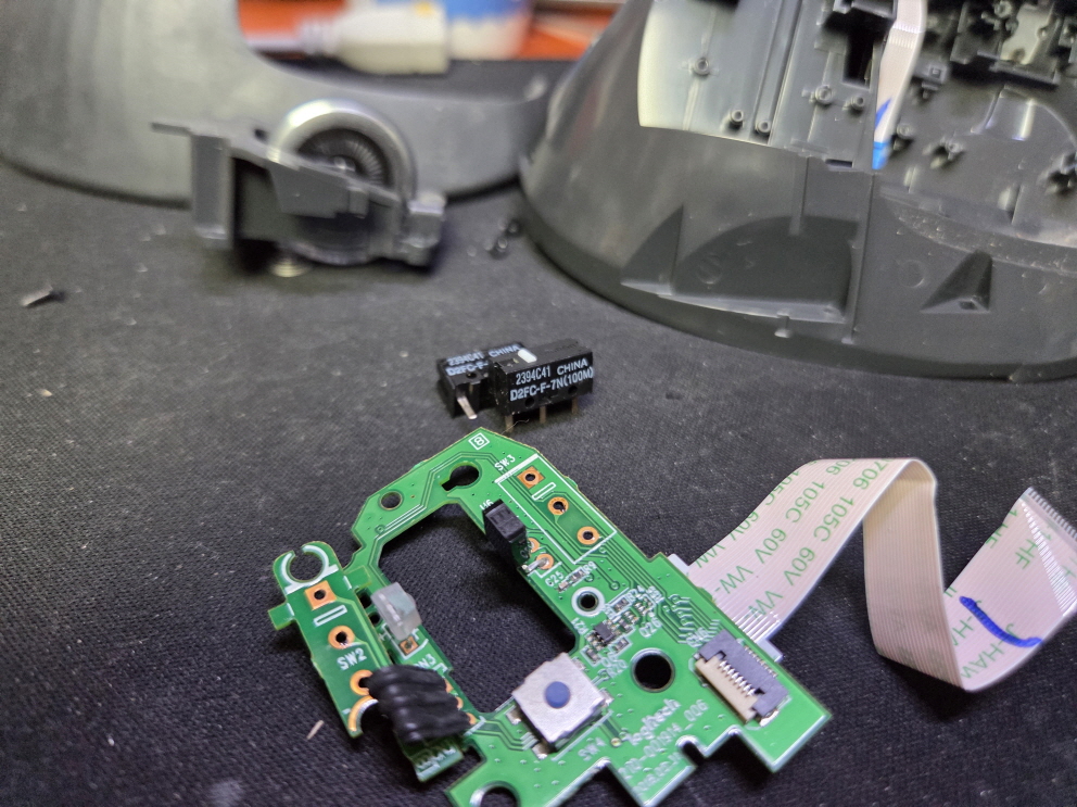 왼쪽버튼 드래그끊기거나 풀림증상인 버튼내 스위치불량으로 새 스위치 D2FC-F-7N(100M) 좌우교체 수리 진행합니다.